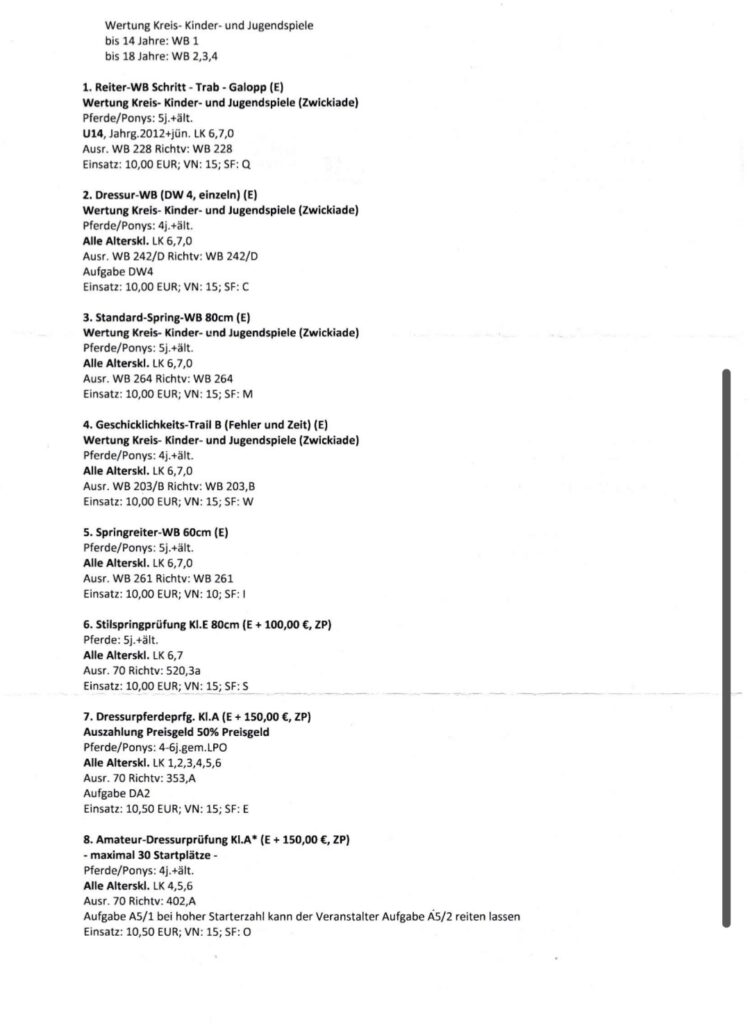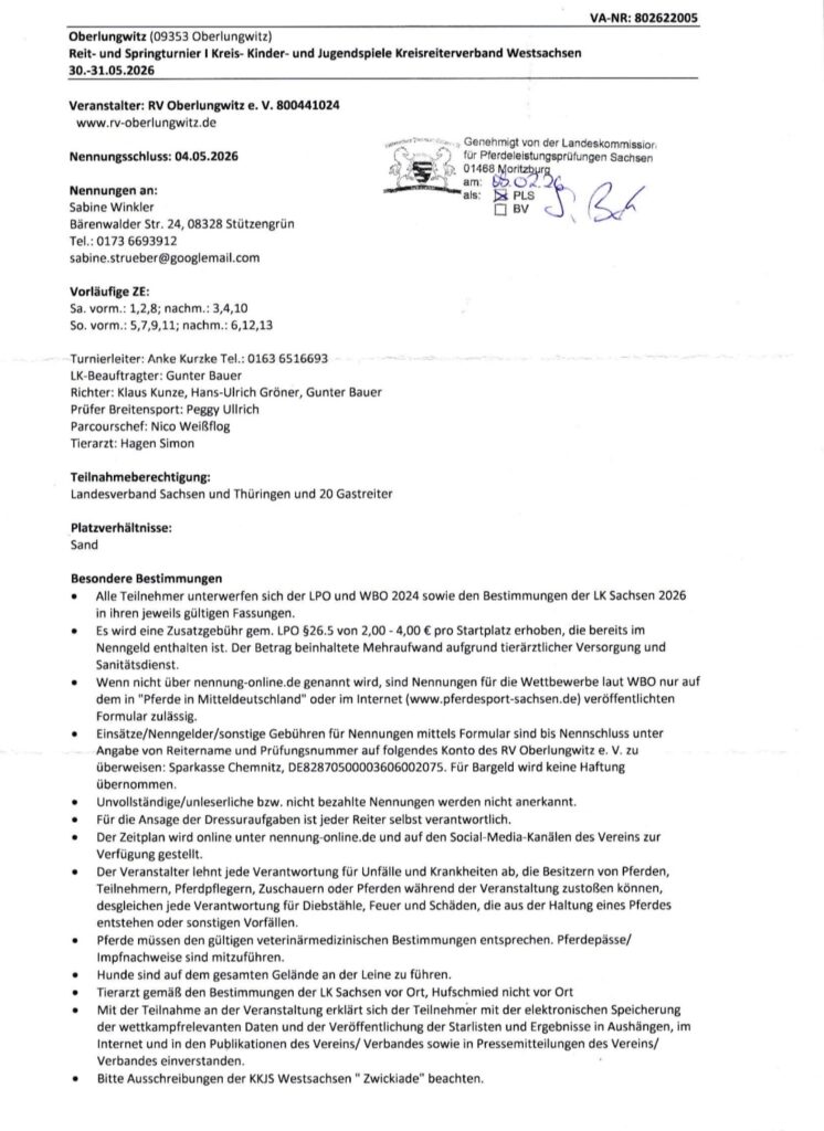 ✨ Wichtige Infos:• Nennungsschluss: 04.05.2026• Prüfungen: Dressur & Springen• Prüfungen von Reiter-WB bis Punktespringprüfung Kl. L (110 cm)• Wertung für Kreis-Kinder- und Jugendspiele Westsachsen• Teilnehmer: Sachsen, Thüringen + Gastreiter